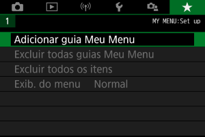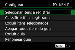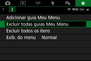 Pode apagar todos os separadores O Meu Menu criados. Se selecionar [Excluir todas guias Meu Menu], todos os separadores de [MY MENU1] a [MY MENU5] serão eliminados e o separador [] voltará à predefinição.