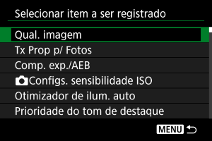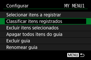 Pode alterar a ordem dos itens registados em O Meu Menu. Selecione [Classificar itens registrados], selecione um item a reordenar e prima o botão . Com a [