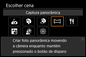 Utilizar o modo [] (Disparo Panorâmico) para fotografar panoramas. O panorama é criado pela combinação de fotos captadas em disparo contínuo enquanto move a câmara numa direção e mantendo completamente premido o botão disparador.
