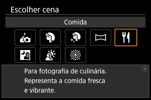 Utilizar o modo [] (Comida) para fotografia de culinária. A fotografia fica brilhante e com um aspeto apetitoso. Além disso, o tom avermelhado devido à fonte de luz será suprimido em fotografias tiradas sob luzes de tungsténio, etc.