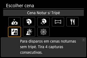 [] (Cena Notur s/ Tripé) permite o disparo portátil para cenas noturnas. Neste modo de disparo, são efetuados quatro disparos consecutivos para cada fotografia e é gravada a imagem resultante com baixa vibração da câmara.