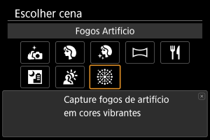 Utilize o modo [] (Fogos Artifício) para fotografar fogo de artifício em cores vivas.