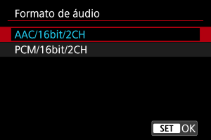 Pode escolher o formato de áudio utilizado para o som na gravação de vídeo.