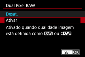 com esta funcionalidade ativada produz imagens especiais Dual Pixel Raw que contêm informações de pixel duplo do sensor de imagem. A esse tipo de captação dá-se o nome de disparo no modo Dual Pixel Raw.