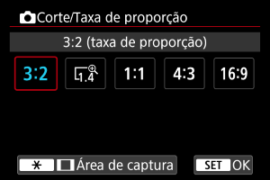 - As imagens RAW quando o recorte/rácio de aspeto está definido para [1:1], [4:3] ou [16:19] são gravadas no rácio de aspeto [3:2] com informação de recorte adicionada para o rácio de aspeto configurado. Esta informação permite que o Digital Photo Professional (software EOS) gere uma imagem com o rácio de aspeto configurado.