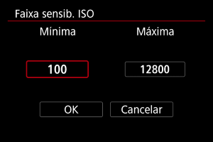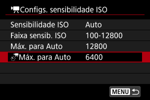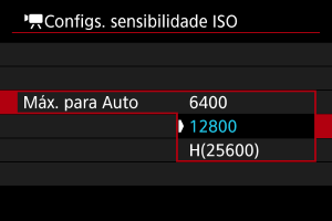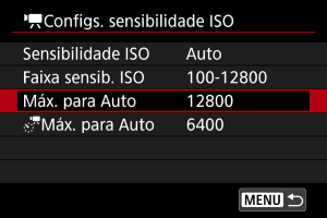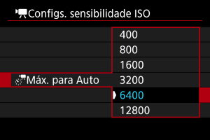 ] com ISO Automático. Por predefinição, o limite máximo está definido para ISO 6400. O limite máximo pode ser definido para um intervalo de ISO 400–12800.