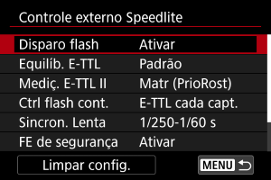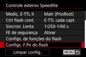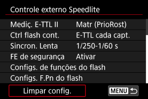 - Selecione [Limpar configurações do flash] ou [Limpar todas F. Pn Speedlite].