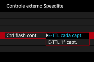 - Defina como [E-TTL cada capt.] para executar a medição do flash para cada disparo.