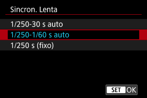 : Controle externo Speedlite] para [1/250-30 s auto] e utilize a captação de imagens com sincronização lenta.