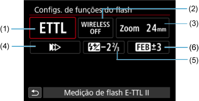As funções dos Speedlites da série EL/EX compatíveis com as definições das funções do flash podem ser definidas através de um ecrã de menu da câmara. Coloque o Speedlite na câmara e ligue o Speedlite antes de definir as funções do flash.