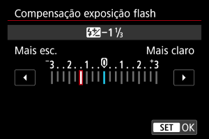 - Se a compensação da exposição do flash for definida com o Speedlite, não é possível definir a compensação da exposição do flash com a câmara. Se for especificada com a câmara e com o Speedlite, a definição do Speedlite anula a da câmara.