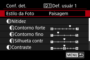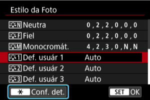 Pode selecionar um Estilo Imagem base, como por exemplo [Retrato] ou [Paisagem], ajustá-lo conforme pretendido, e registá-lo em [Def. usuár 1] – [Def. usuár 3]. Útil quando criar vários Estilos Imagem com definições diferentes.