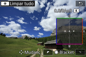 - B significa azul, A significa âmbar, M significa magenta e G significa verde. O balanço de brancos é corrigido na direção em que move a marca.