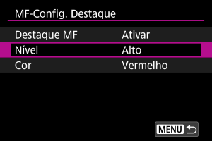 - O visor do realce pode ser difícil de discernir em velocidades ISO elevadas, sobretudo quando a expansão ISO está definida. Se necessário, baixe a velocidade ISO ou defina [Destaque MF] para [Desat.].