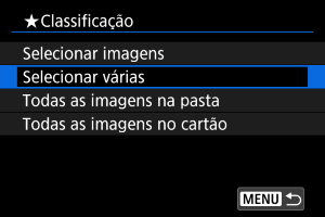 : Classificação], quando selecionar [Todas as imagens na pasta] ou [Todas as imagens no cartão], todas as imagens na pasta ou no cartão serão classificadas.