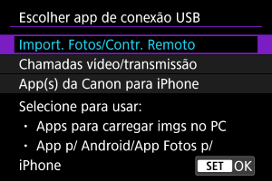 Depois de selecionar [Chamadas vídeo/transmissão], utilize o cabo de interface para ligar ao computador e, em seguida, inicie a aplicação.