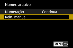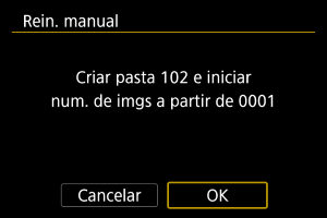 Quando reinicia manualmente a numeração de ficheiros, é criada uma nova pasta automaticamente e a numeração de ficheiros de imagens guardadas nessa pasta começa a partir de 0001.