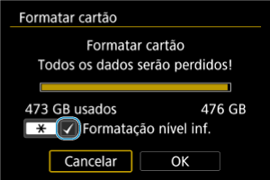 - Durante a formatação de baixo nível, pode cancelar a formatação selecionando [Cancelar]. Mesmo neste caso, a formatação normal já estará concluída e pode utilizar o cartão como habitualmente.