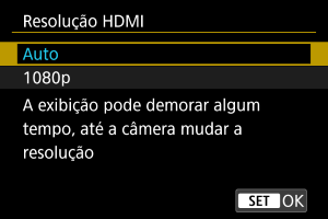 Defina a resolução utilizada para saída de imagens quando a câmara está ligada a um televisor ou dispositivo de gravação externo com um cabo HDMI.