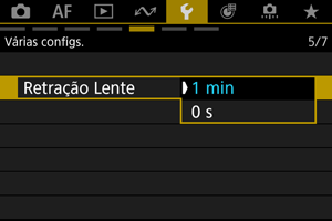 Carregue no botão no modo de disparo para recolher a objetiva com segurança após cerca de 1 min. Para recolher imediatamente a objetiva depois de premir o botão , defina o tempo de retração para [0 s].