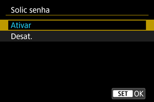 Pode escolher se é necessário introduzir uma palavra-passe depois de o interruptor de alimentação ser definido para ou a câmara retoma o funcionamento a partir do desligar auto.