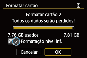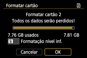 - Durante a formatação de baixo nível, pode cancelar a formatação selecionando [Cancelar]. Mesmo neste caso, a formatação normal já estará concluída e pode utilizar o cartão como habitualmente.