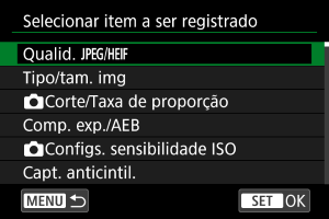 Pode alterar a ordem dos itens registados em O Meu Menu. Selecione [Classificar itens registrados], selecione um item a redispor e carregue em