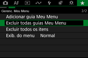 Pode apagar todos os separadores O Meu Menu criados. Se selecionar [Excluir todas guias Meu Menu], todos os separadores de [MY MENU1] a [MY MENU5] serão eliminados e o separador [] voltará à predefinição.