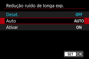 Para imagens expostas durante 1 seg. ou mais, a redução de ruído é efetuada automaticamente, caso seja detetado o ruído típico de exposições longas. Na maior parte dos casos, esta definição é suficientemente eficaz.