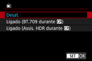 Disparo HDR (PQ)] ou no disparo com imagens personalizadas () aplicado, conforme apresentado no ecrã da câmara ou dispositivos de visualização não-HDR conectados através de HDMI, pode ser feito parecer semelhante ao apresentado em dispositivos com HDR.