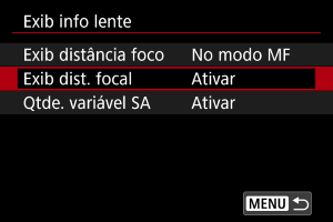 Pode exibir a distância de focagem quando usar objetivas RF. Na visualização da distância de focagem, pode selecionar o tempo e unidade de medida.