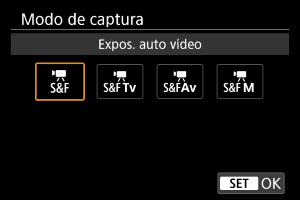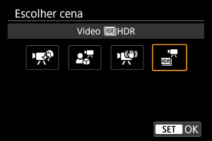 , selecione um modo de gravação após tocar no ícone no canto superior esquerdo ou aceder ao ecrã [Escolher cena] ou [Modo de captura] em [