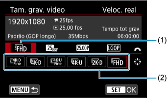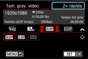 Os vídeos podem ser gravados para reprodução em câmara lenta ou rápida. O som não é gravado. Defina a velocidade de movimento lento ou rápido (velocidade de reprodução) em [: Tam. grav. vídeo].