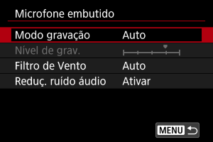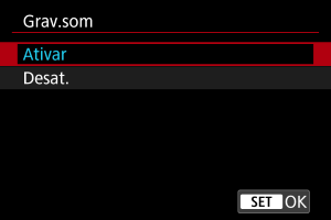 Selecione [Ativar] para gravação de som durante a gravação de vídeo. O microfone incorporado é usado para gravação, a menos que utilize microfones externos ou projetados para a sapata multifunções.