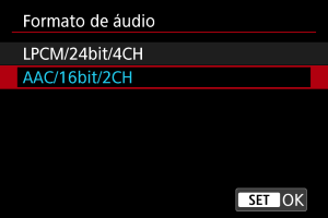 - A seleção de [LPCM/24bit/4CH] permite a gravação de som de quatro canais. Selecionar [AAC/16bit/2CH] restringe a gravação a dois canais (com um único microfone).