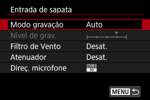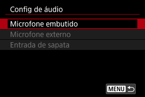 Configure microfones para gravação de som nestas definições. Quando utilizar microfones externos ou concebidos para uma sapata multifunções, consulte também o manual de instruções do microfone.