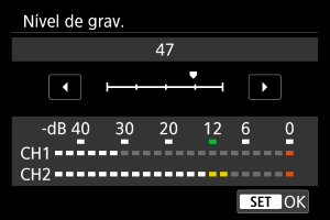 Pode regular o nível de gravação de som conforme necessário. Ajuste o nível em [Nível de grav.].