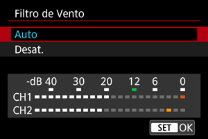 Defina para [Auto] (ou [Ativar]) para reduzir a distorção de áudio em cenas no exterior com vento. Quando a função de filtro de vento é ativada, alguns sons graves profundos também são reduzidos.