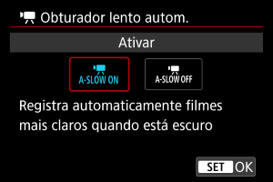 Pode escolher se deseja gravar vídeos que são mais brilhantes e menos afetados pelo ruído da imagem do que quando definido para [Desat.] ao abrandar a velocidade do obturador automaticamente em condições de pouca luz.