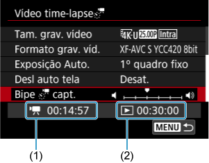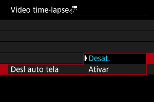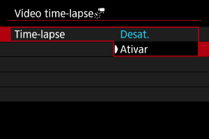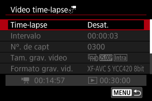 - Para cancelar a gravação de vídeos time-lapse, defina [Time-lapse] para [Desat.].