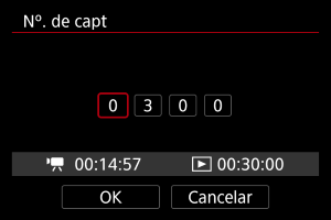 - Se definir o número de disparos para 3600, o vídeo time-lapse terá a duração de aprox. 2 min. em NTSC e aprox. 2 min. 24 seg. em PAL.
