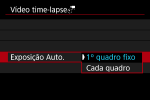 - Com [Exposição Auto.] definida para [Cada quadro], a velocidade ISO, a velocidade do obturador e valor da abertura podem não ser gravados na informação Exif do vídeo time-lapse nalguns modos de disparo.