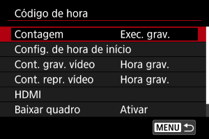 - Os códigos de tempo são sempre adicionados aos ficheiros de vídeo, independentemente da definição [Cont. grav. vídeo].