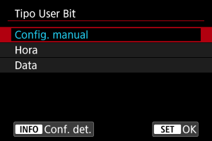 Pode adicionar informações à sua escolha (um valor hexadecimal de 8 dígitos, a hora ou a data) ao código de tempo do bit do utilizador.