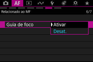 Definir [: Guia de foco] para [Ativar] apresenta um moldura auxiliar que mostra em que direção ajustar o foco e a extensão do ajuste necessário.