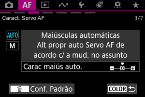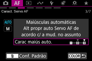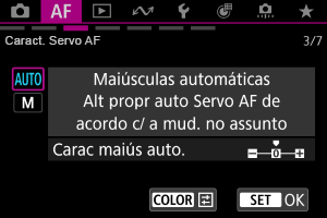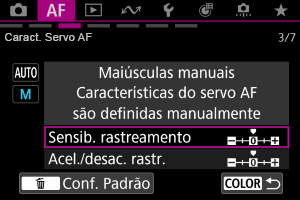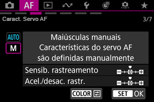 Pode definir parâmetros de rastreamento de Servo AF (sensibilidade de rastreamento do motivo e rastreamento de aceleração/desaceleração) para o motivo e situação de disparo.