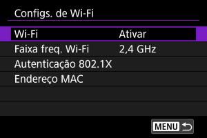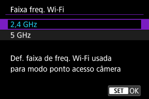 Selecione a banda de frequência para o modo de ponto de acesso da câmara, conforme necessário. Esta gama de frequências também se aplica a ligações Wi-Fi estabelecidas utilizando funções Bluetooth.