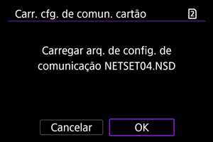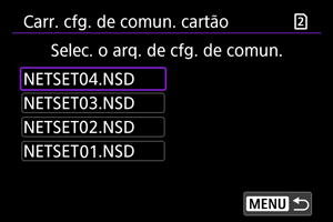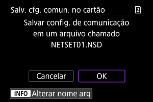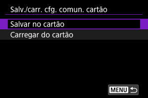 : Salv./carr. conf. câm. cartão] permite guardar todas as definições de comunicação na câmara num cartão ou carregar todas as definições de comunicação para outra câmara a partir de um cartão.