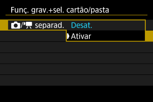 Selecione [Ativar] para a configuração automática do método de gravação para fotografias e vídeos. Os vídeos são gravados no cartão e as fotografias no cartão