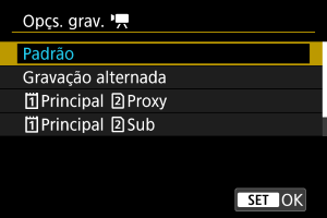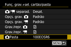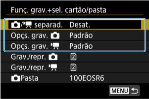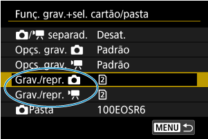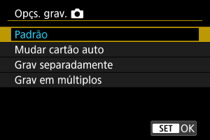 Com [Opçs. grav. ] definido para [Padrão]/[Mudar cartão auto] ou com [Opçs. grav.